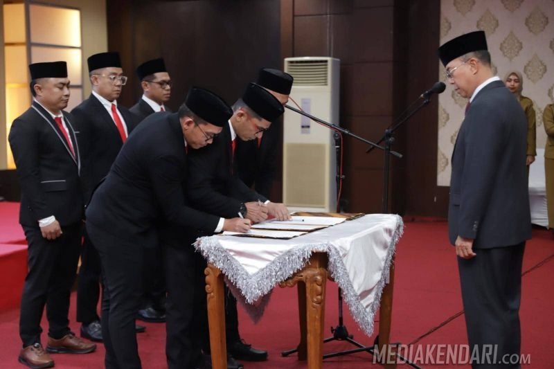 Kendari, Mediakendari.com – Gubernur Sulawesi Tenggara, Mayjen TNI (Purn) Andi Sumangerukka, secara resmi melantik Direksi dan Dewan Pengawas Perusahaan Umum Daerah (PERUMDA) Utama Sultra. Prosesi pelantikan berlangsung khidmat di Aula Merah Putih Rumah Jabatan Gubernur Sultra pada Senin, 14 Juli 2025.