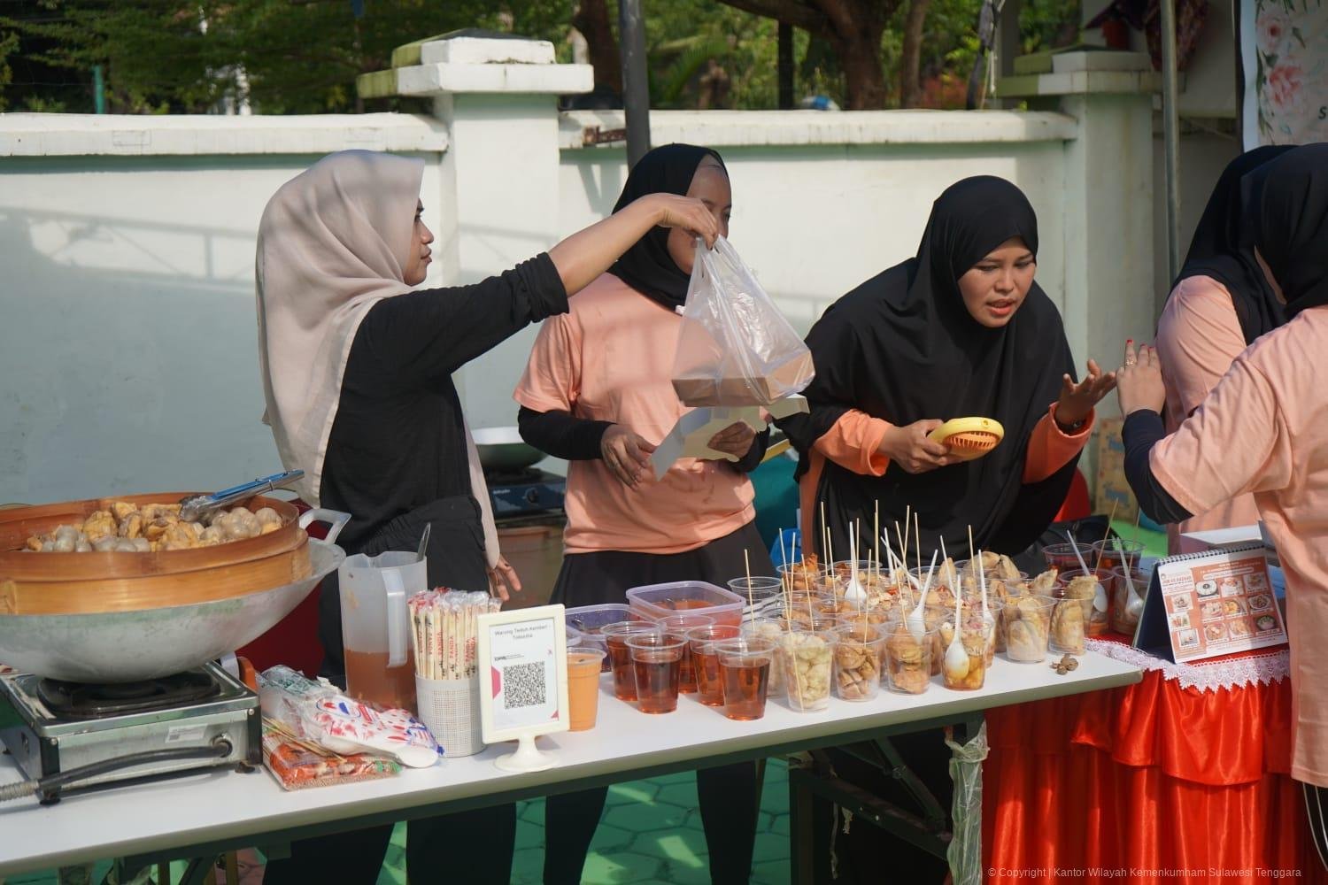 Para anggota DWP Kanwil Kemenkum Sultra juga tak ketinggalan memamerkan kreativitasnya. Lapak-lapak mereka dipenuhi kue buatan sendiri, makanan siap saji, hingga produk rumahan yang dikelola secara mandiri. Perputaran transaksi berlangsung cepat, membuat suasana semakin hidup.