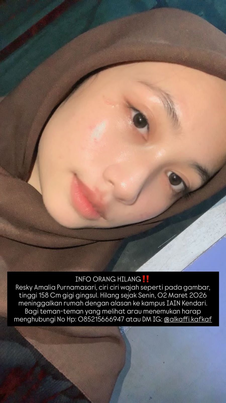 KENDARI, MEDIAKENDARI.com – Seorang mahasiswi Institut Agama Islam Negeri (IAIN) Kendari, Resky Amalia Purnamasari (19), dilaporkan hilang setelah tidak kembali ke rumah sejak Senin (2/3/2026).