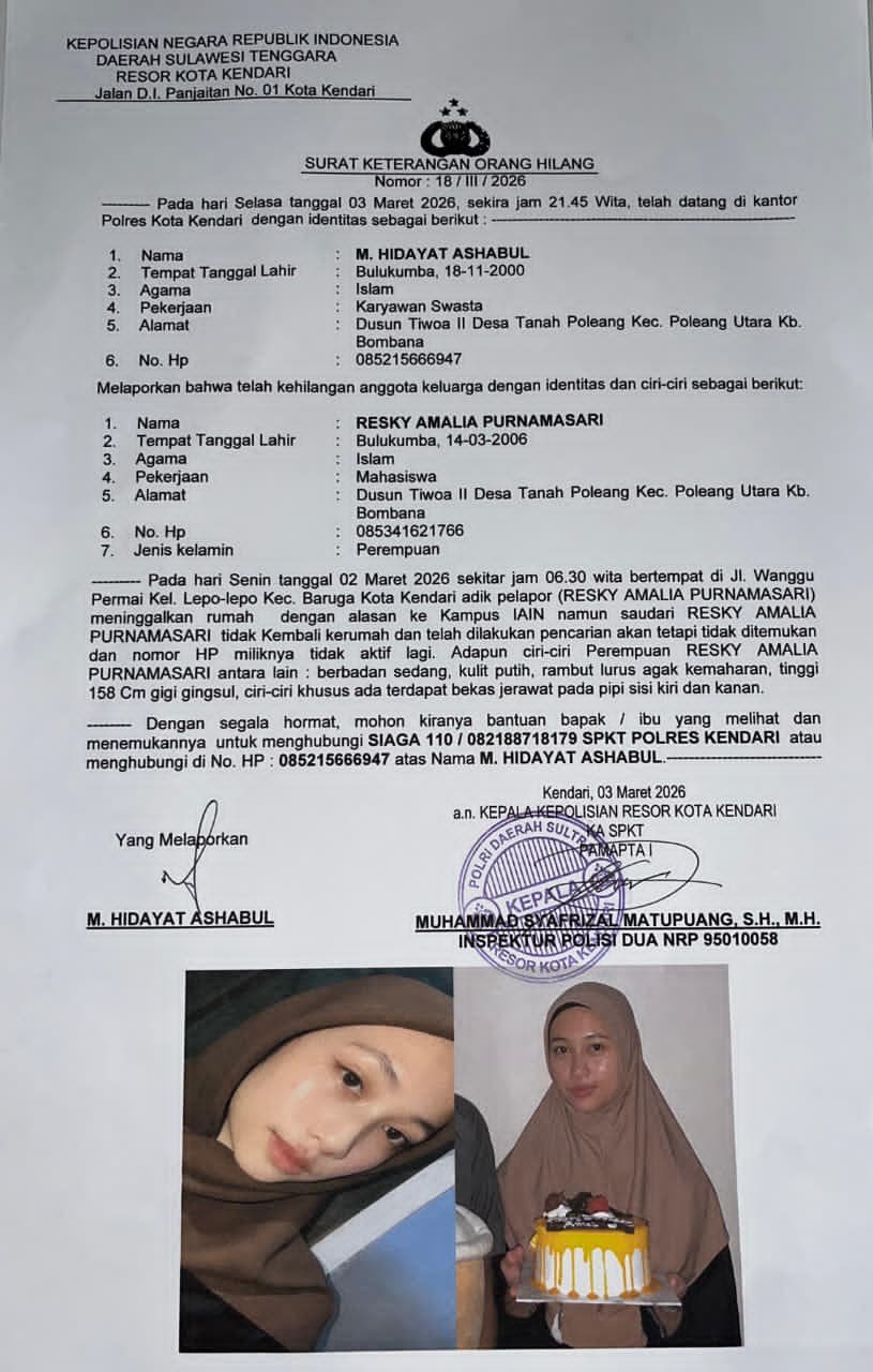KENDARI, MEDIAKENDARI.com – Seorang mahasiswi Institut Agama Islam Negeri (IAIN) Kendari, Resky Amalia Purnamasari (19), dilaporkan hilang setelah tidak kembali ke rumah sejak Senin (2/3/2026).