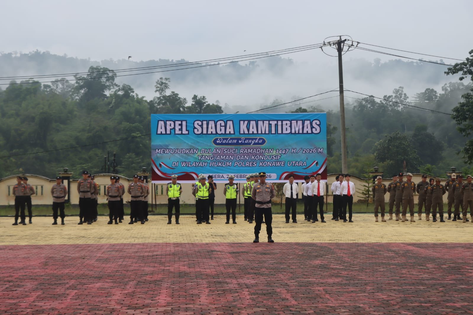 KONAWE UTARA, MEDIAKENDARI — Menyambut bulan suci Ramadan 1447 Hijriah/2026 Masehi, Polres Konawe Utara menggelar Apel Siaga Keamanan dan Ketertiban Masyarakat (Kamtibmas) di Lapangan Mako Polres Konawe Utara, Selasa pagi (24/2/2026).