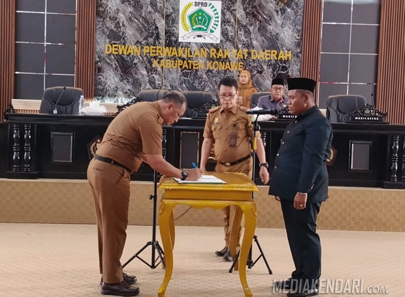 KONAWE, Mediakendari.com – Dewan Perwakilan Rakyat Daerah (DPRD) Kabupaten Konawe bersama Pemerintah Daerah resmi menandatangani Nota Kesepahaman terhadap dua Rancangan Peraturan Daerah (Raperda) inisiatif eksekutif, dalam Rapat Paripurna yang digelar pada Senin, 21 Juli 2025.