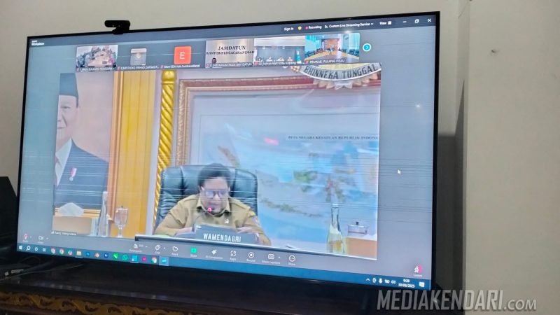 Kegiatan ini berlangsung secara hybrid dari Ruang Sidang Utama Kantor Pusat Kemendagri dan diikuti secara virtual oleh seluruh pemerintah daerah di Indonesia melalui Zoom Meeting, termasuk Pemprov Sultra yang mengikutinya dari Ruang Rapat Biro Perekonomian Setda Provinsi Sultra, Senin (30/6/2024).