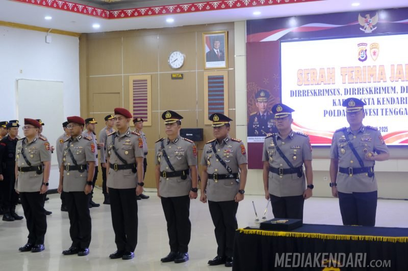 Kendari, Mediakendari.com – Kepala Kepolisian Daerah Sulawesi Tenggara, Irjen Pol Didik Agung Widjanarko, S.IK., M.H memimpin serah terima jabatan (Sertijab) sejumlah pejabat utama Polda Sultra dan Kapolresta Kendari dalam sebuah upacara resmi yang digelar di Aula Dachara Polda Sultra, Jumat (4/7/2025).