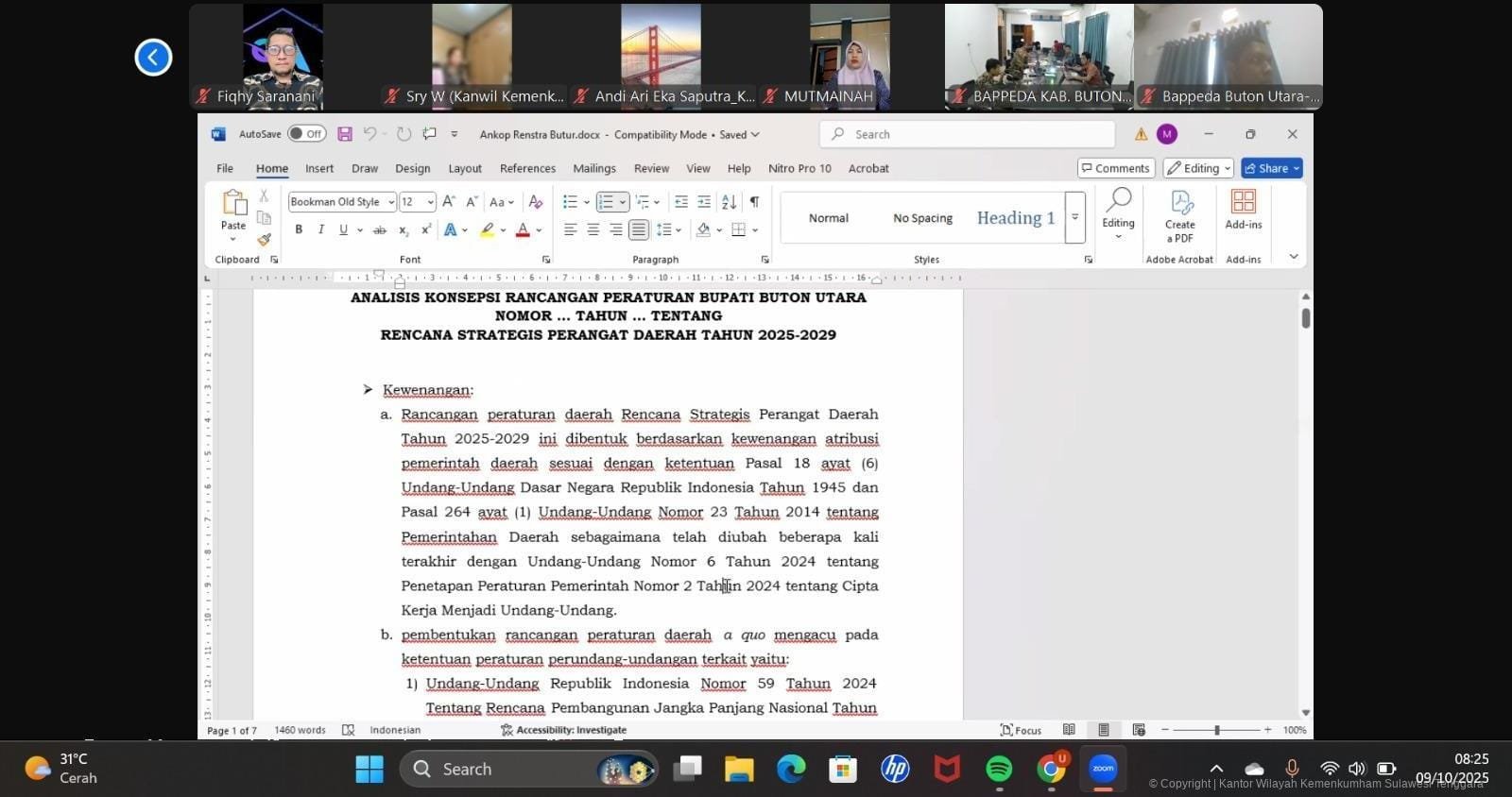 Kegiatan dilaksanakan secara hybrid, diikuti oleh Kepala Bappeda berserta jajaran dan Bagian hukum Sekretariat Daerah Kabupaten Buton Utara.