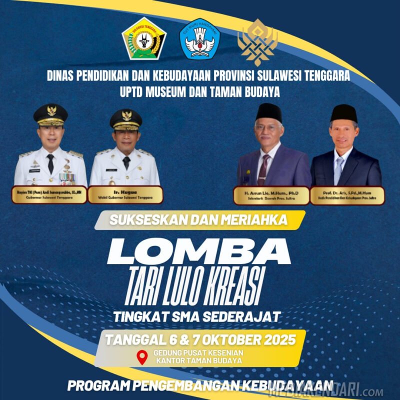 Kendari,MEDIAKENDARI.COM 6-7 Oktober 2025 — Puluhan pelajar tingkat SMA/sederajat dari berbagai daerah di Provinsi Sulawesi Tenggara (Sultra) unjuk kebolehan dalam ajang Lomba Tari Lulo Kreasi yang berlangsung di Gedung Pusat Kesenian, Kantor Taman Budaya Sultra, pada tanggal 6 dan 7 Oktober 2025.