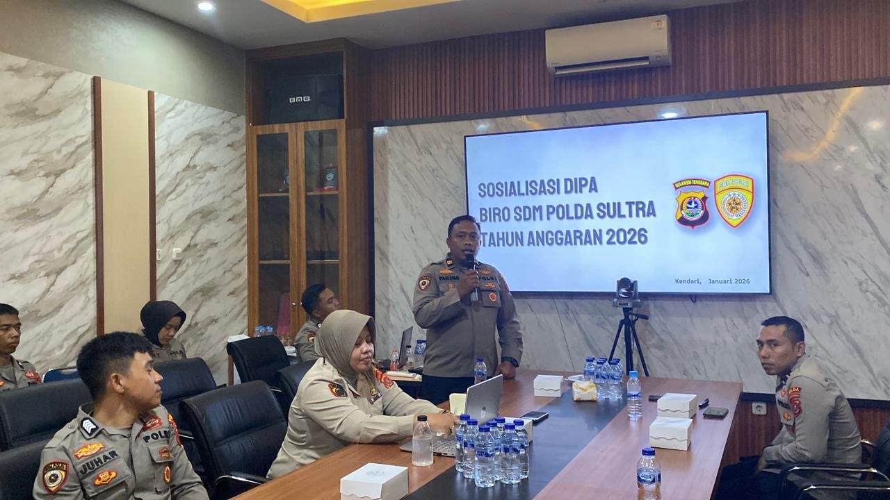 KENDARI, MEDIAKENDARI.com – Biro Sumber Daya Manusia (SDM) Polda Sulawesi Tenggara (Sultra) menggelar Sosialisasi Daftar Isian Pelaksanaan Anggaran (DIPA) Tahun Anggaran 2026 yang dirangkaikan dengan Analisis dan Evaluasi (Anev) Kinerja Anggaran Tahun Anggaran 2025, Rabu (14/1/2026).