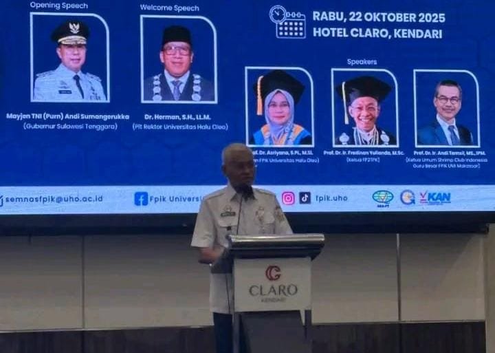 Hal ini disampaikannya melalui sambutan tertulis yang dibacakan oleh Sekretaris Daerah Sultra, Drs. H. Asrun Lio, M.Hum., Ph.D., pada pembukaan Seminar Nasional bertema “Indonesia Emas 2045: Transformasi Pendidikan Tinggi, Sains, dan Teknologi dalam Mendorong Ekonomi Biru”, Rabu (22/10/2025).