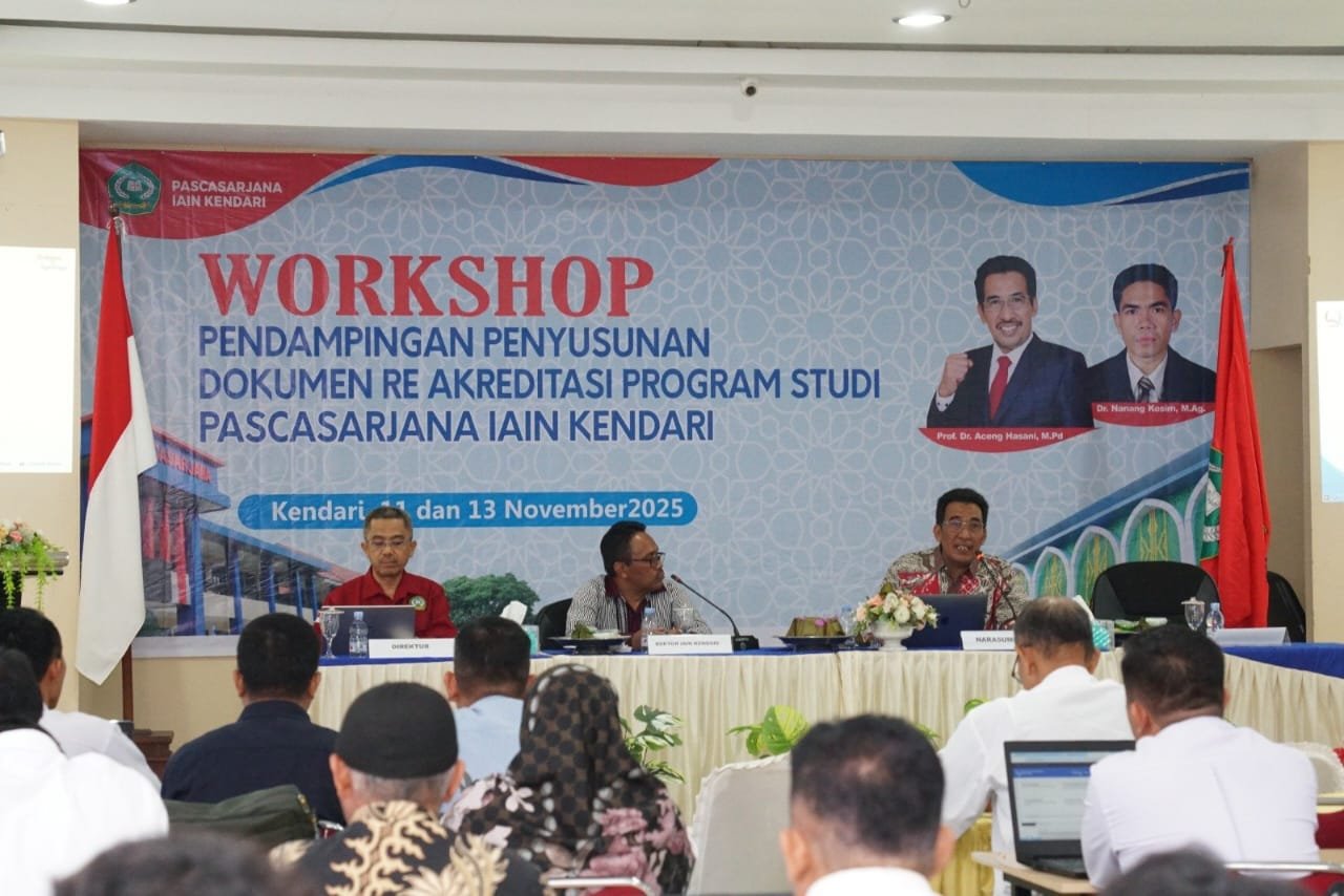 KENDARI, MEDIAKENDARI.com – Pascasarjana Institut Agama Islam Negeri (IAIN) Kendari menyelenggarakan Workshop Pendampingan Penyusunan Dokumen Re-Akreditasi Program Studi, di Aula Pascasarjana, Selasa (11/11/2025). Kegiatan ini menghadirkan Direktur Akreditasi Lembaga Akreditasi Mandiri Kependidikan (LAMDIK) Prof. Dr. Aceng Hasani, M.Pd.