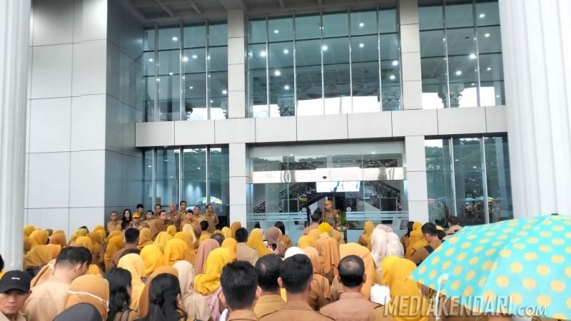 Kendari, Mediakendari.com – Sekretaris Daerah (Sekda) Provinsi Sulawesi Tenggara, Drs. H. Asrun Lio, M.Hum., Ph.D, memimpin apel gabungan Aparatur Sipil Negara (ASN) lingkup Pemerintah Provinsi Sulawesi Tenggara yang digelar di Lapangan Kantor Gubernur, Senin pagi (23/6/2025). Apel ini diikuti oleh para kepala Organisasi Perangkat Daerah (OPD), kepala biro, pejabat struktural dan fungsional, serta ribuan ASN dari berbagai instansi di lingkungan Pemprov Sultra.