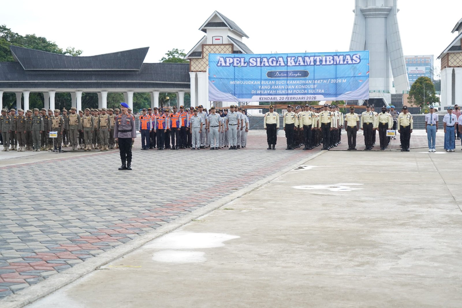 KENDARI, MEDIAKENDARI – Kepolisian Daerah Sulawesi Tenggara (Polda Sulawesi Tenggara) menggelar Apel Siaga Keamanan dan Ketertiban Masyarakat (Kamtibmas) dalam rangka mewujudkan situasi yang aman dan kondusif selama bulan suci Ramadan 1447 Hijriah/2026 Masehi. Apel berlangsung di Lapangan Eks MTQ Kendari, Jumat (20/2/2026).