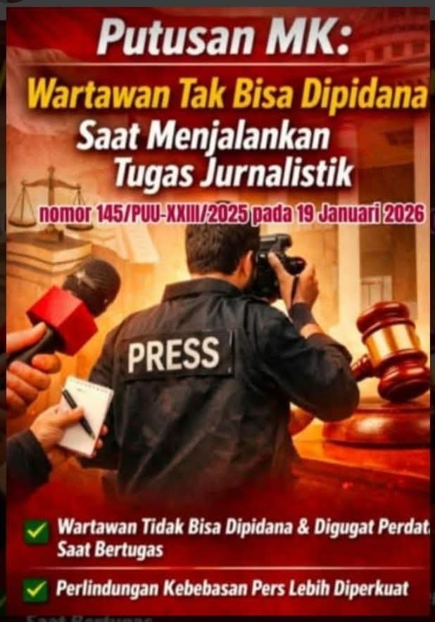 JAKARTA, MEDIAKENDARI.COM – Mahkamah Konstitusi (MK) menegaskan pentingnya perlindungan hukum bagi wartawan dalam menjalankan aktivitas jurnalistik melalui Putusan Nomor 145/PUU-XXIII/2025 yang dibacakan pada November 2025. Putusan tersebut dinilai menjadi langkah penting dalam memperkuat kebebasan pers sekaligus mencegah potensi kriminalisasi terhadap jurnalis.