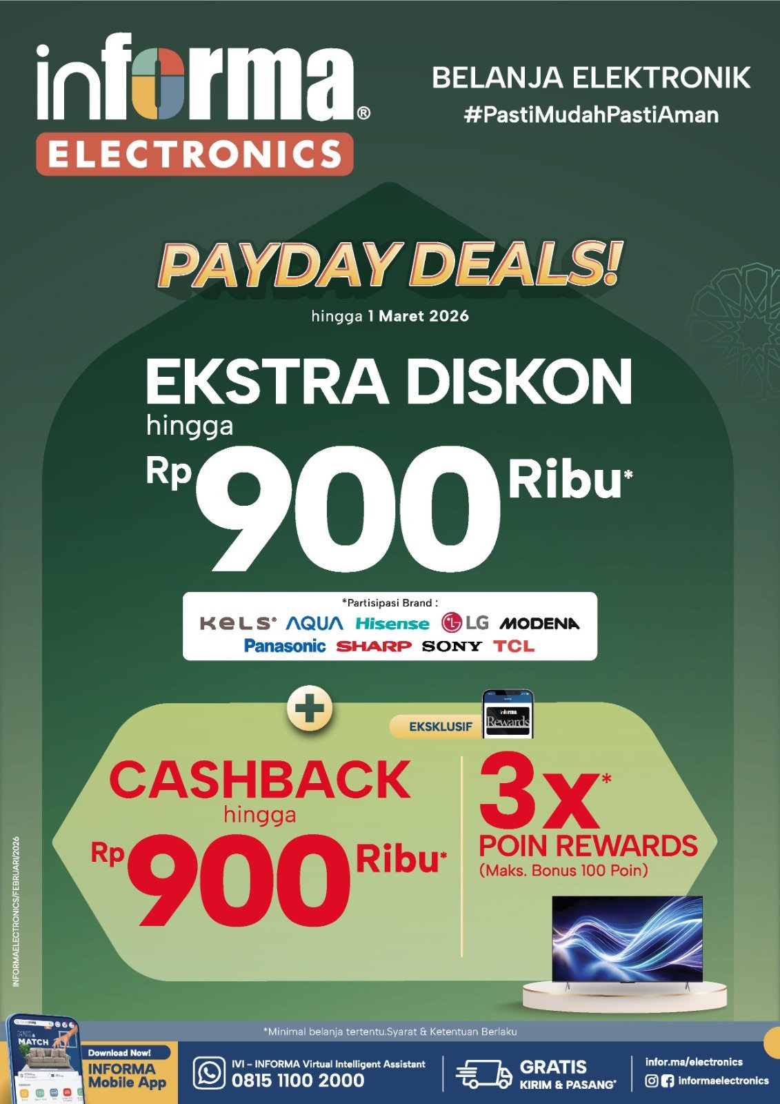 Sementara itu, INFORMA Electronics turut menghadirkan penawaran khusus berupa ekstra diskon hingga Rp900 ribu untuk merek tertentu, cashback hingga Rp900 ribu bagi member INFORMA Rewards, serta bonus tiga kali poin rewards dengan maksimal 100 poin. Promo elektronik ini berlaku hingga 28 Februari 2026.