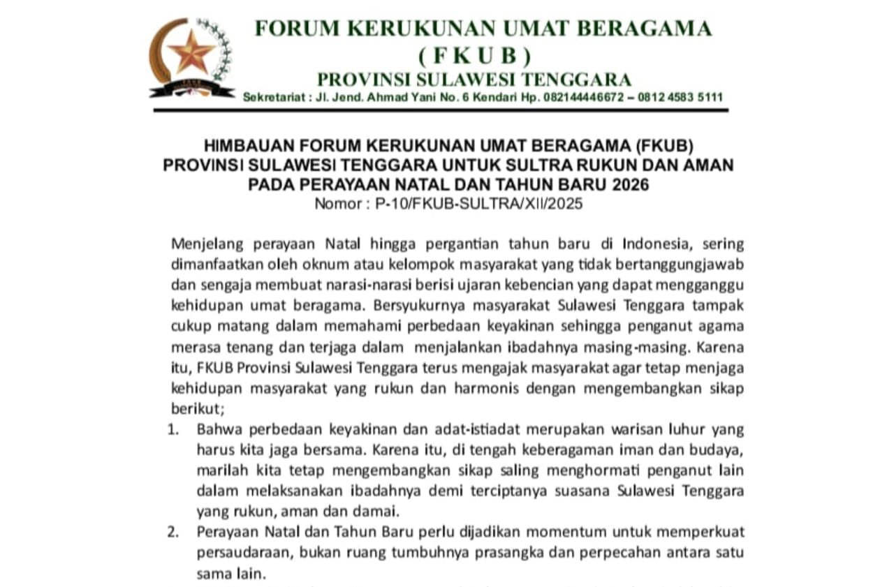 Imbauan tersebut disampaikan FKUB Sultra melalui surat resmi bernomor P-10/FKUB-SULTRA/XII/2025, yang menyoroti potensi meningkatnya provokasi, ujaran kebencian, serta narasi negatif yang kerap muncul menjelang hari-hari besar keagamaan.