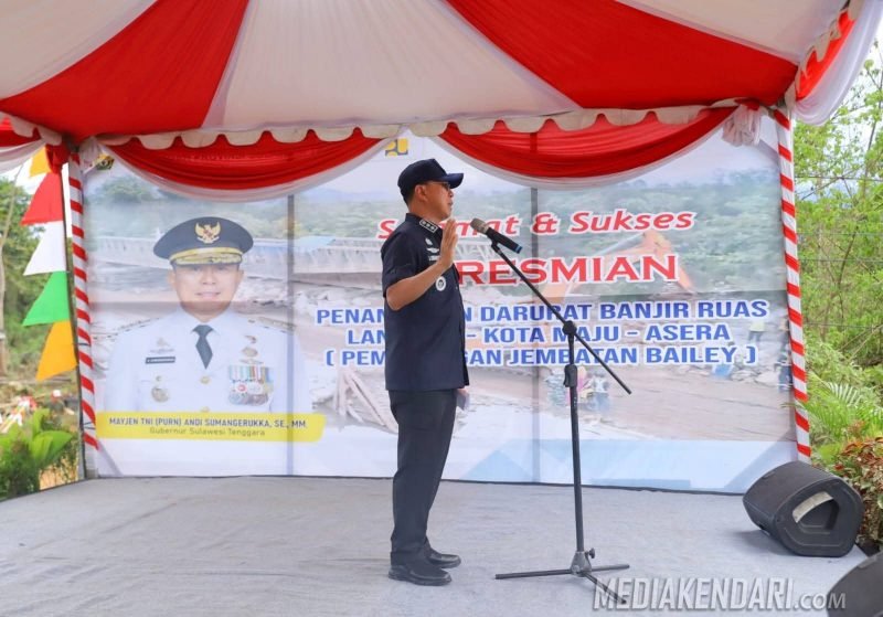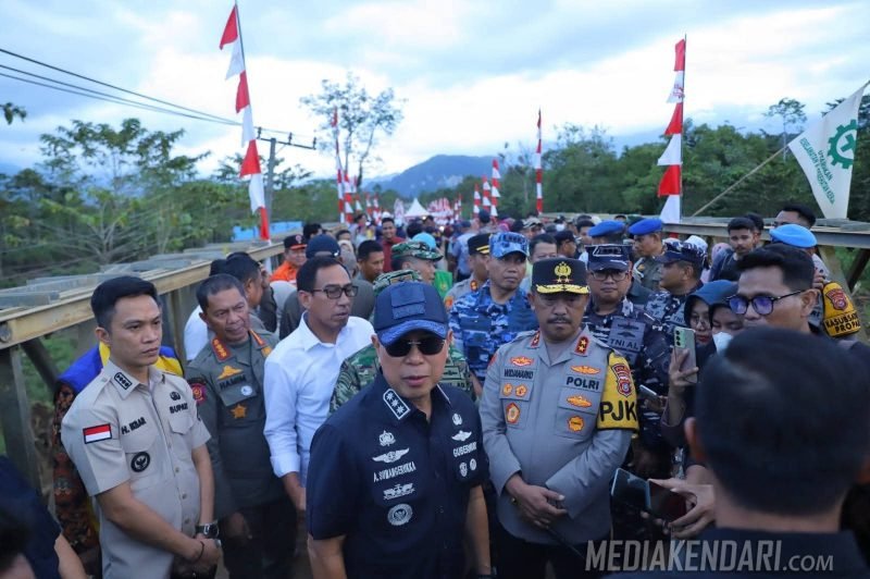 KONUT, Mediakendari.com – Gubernur Sulawesi Tenggara, Mayjen TNI (Purn) Andi Sumangerukka, secara resmi meresmikan Jembatan Bailey yang terletak di Desa Sambandete, Kecamatan Oheo, Kabupaten Konawe Utara (Konut), pada Jumat, 25 Juli 2025.