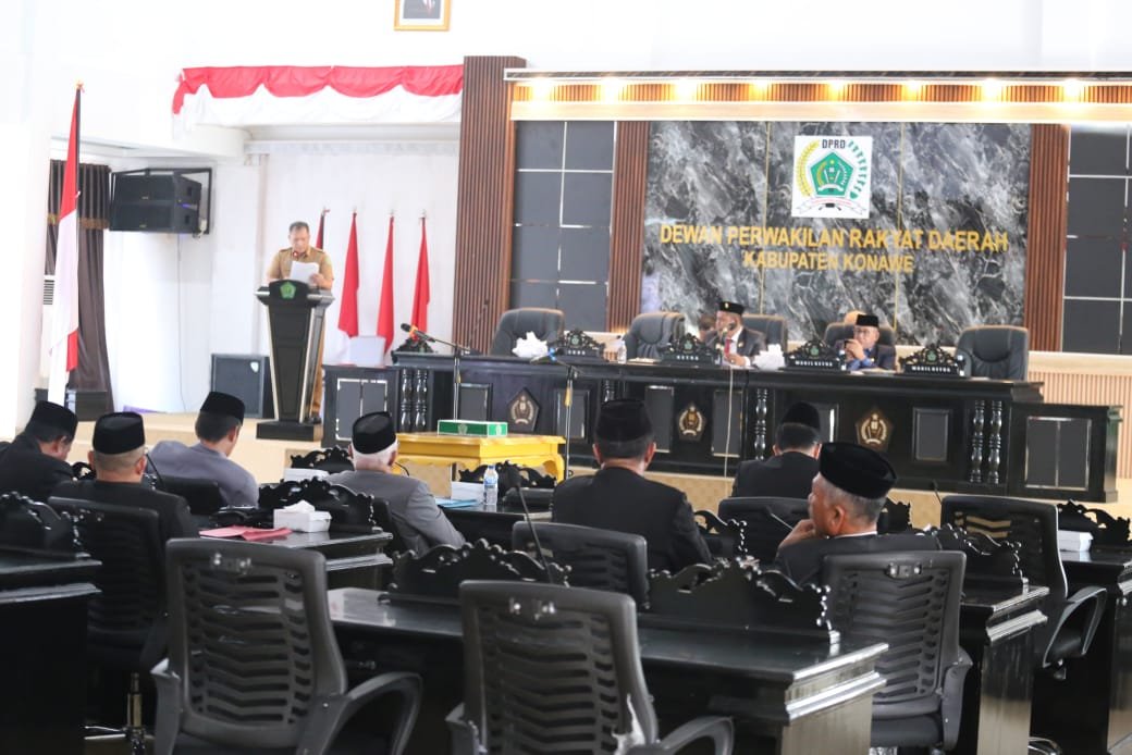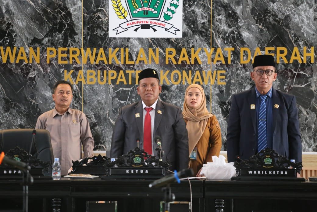 Rapat paripurna yang dipimpin langsung oleh Ketua DPRD Konawe, I Made Asmaya, S.Pd., M.M., berjalan penuh khidmat. Ia didampingi dua Wakil Ketua, Nuryadin Tombili, S.T. dan Nasrullah Faizal, S.H.