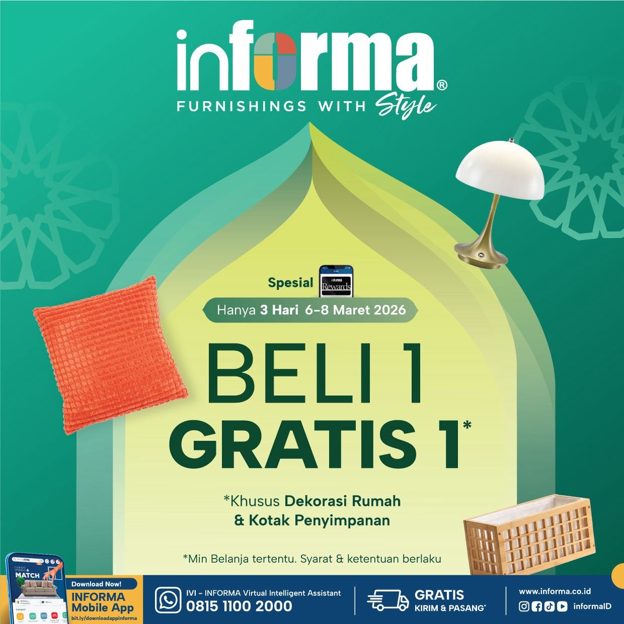 KENDARI, MEDIAKENDRI.COM – Menyambut datangnya bulan suci Ramadhan 2026, Informa Kendari menghadirkan program promo spesial bagi masyarakat yang ingin mempercantik hunian dengan cara lebih hemat. Melalui program “Beli 1 Gratis 1”, pelanggan berkesempatan mendapatkan produk dekorasi rumah tambahan secara cuma-cuma dalam periode terbatas.