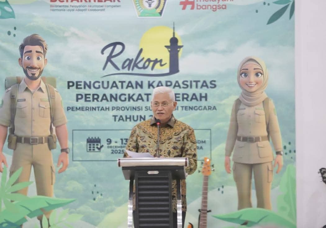 KENDARI, MEDIAKENDARI.com, – Sekretaris Daerah Provinsi Sultra, Asrun Lio, secara resmi menutup Rapat Koordinasi (Rakor) Penguatan Kapasitas Perangkat Daerah Pemerintah Provinsi Sulawesi Tenggara Tahun 2025. Kegiatan penutupan berlangsung di Aula Asrama C BPSDM Provinsi Sulawesi Tenggara, Jumat malam (12/12/2025).