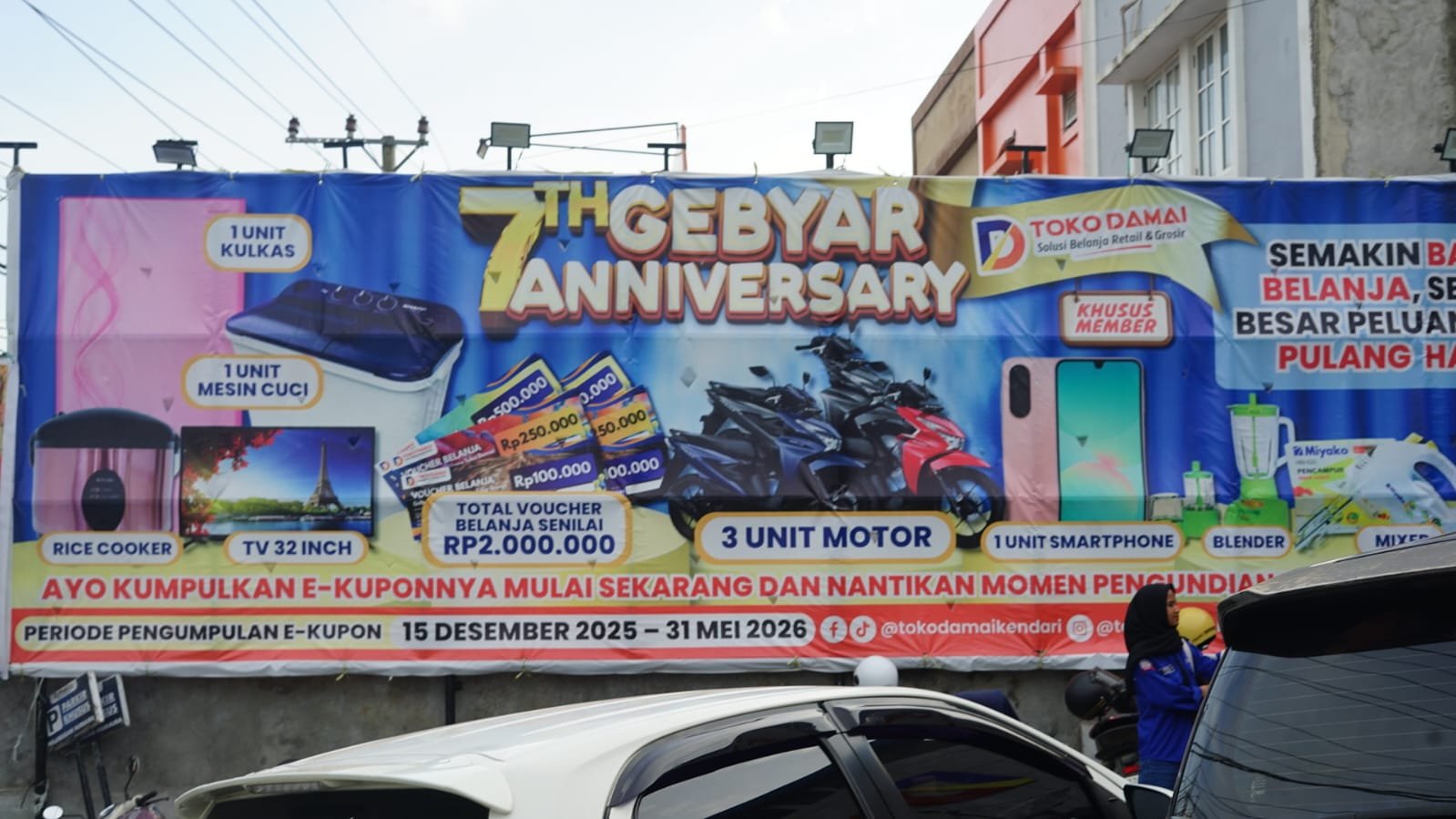 Promo 7th Gebyar Anniversary Toko Damai Kendari menghadirkan berbagai hadiah undian bagi pelanggan, Selasa (3/3/2026).